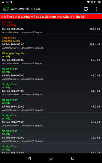 Als je op de hoogte wilt worden gehouden van de huidige status van de geomagnetische activiteit, moet je de AuroraWatch UK-app installeren. Het zal dan automatisch de status van het waarschuwingsniveau elke 30 minuten bijwerken. Als het activiteitsniveau hoog is, word je op de hoogte gesteld en krijg je de details van de locatie waar je bent en de tijd waarop je er bent. Als het activiteitsniveau laag is, word je niet op de hoogte gesteld.